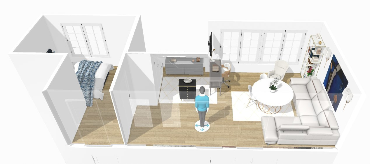 Le souhait du client était d'installer le lit double dans la petite pièce ouverte sur l'entrée, et placer quelque part un canapé d'angle en cuir et un bureau.
